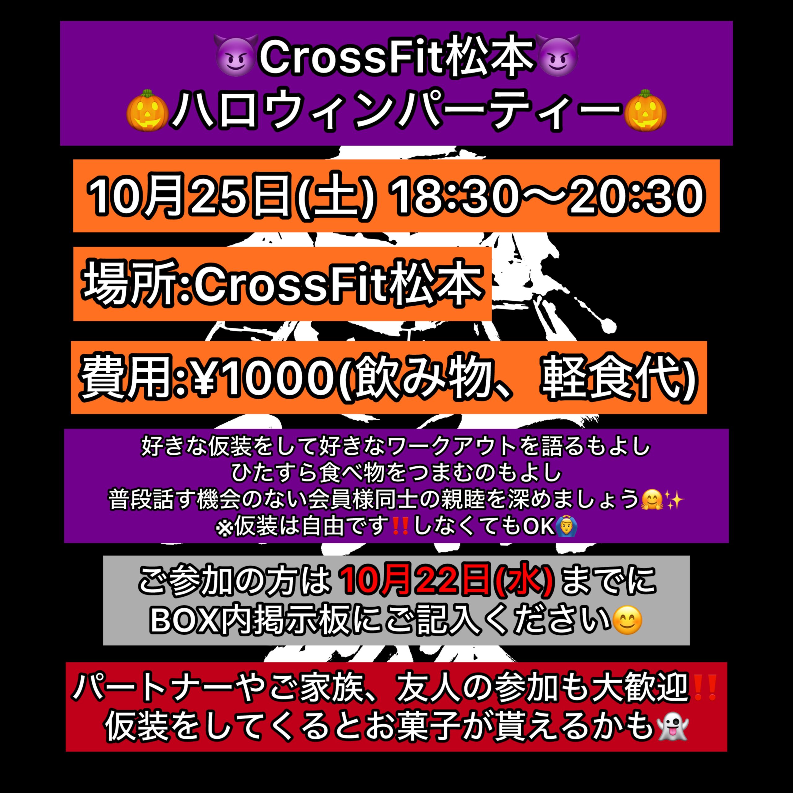料理の注文の関係で人数を把握したいので参加希望の方は10月22日(水)までにCrossFit松本内の掲示板に名前と参加人数をご記入ください😊🙌